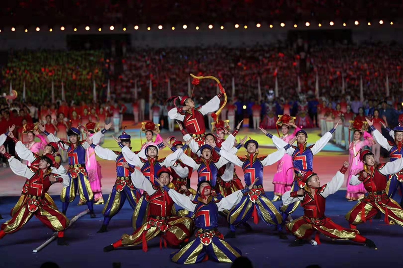 开幕式入场仪式中,辽宁健儿精神饱满地走过主席台,在驻停区进行满族舞蹈表演。韵味悠长、特点鲜明的满族舞蹈艺术,不仅展现了满族人民悠久的历史文化,也展现了满族人民的劳动生活、风俗习惯和审美追求,引起现场阵阵掌声。